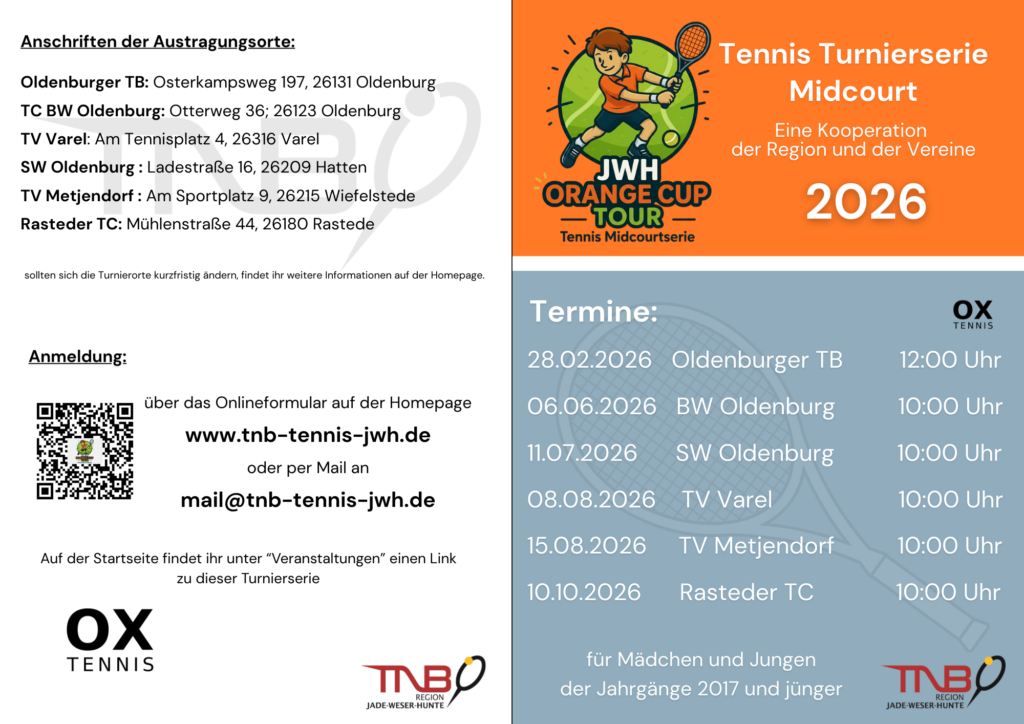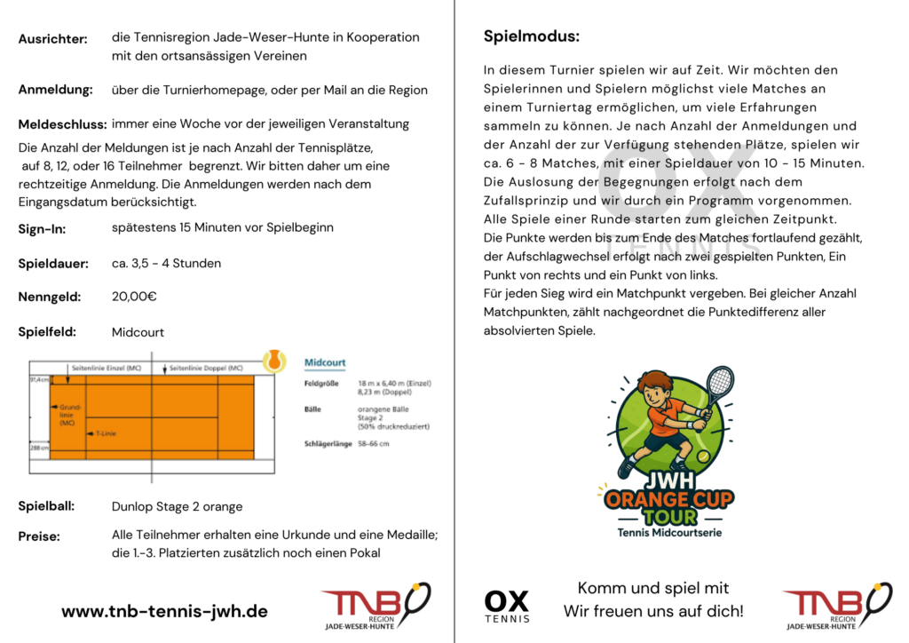 2026 bietet die Tennisregion Jade-Weser-Hunte in Kooperation mit den Vereinen der Region eine neue Midcourt-Turnierserie an. Alle tennisinteressierten Kinder im Alter bis 9 Jahren und jünger dürfen bei unseren Turnieren Wettkampferfahrungen sammeln. Um an unseren Turnieren teilnehmen zu können, müsst ihr noch keine Profis sein. Auch wenn ihr erste seit kurzes Zeit Tennis spielt, seid ihr bei uns genau richtig.